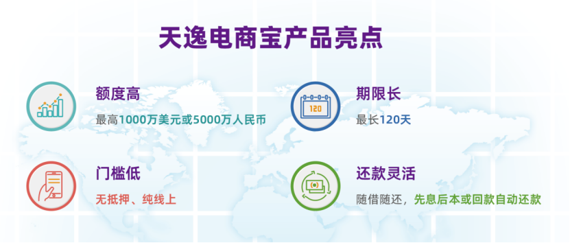 天逸电商宝的“天e贷”产品是针对亚马逊SC卖家提供的融资服务解决方案,通过智能化的平台,为亚马逊SC卖家提供高额度、纯线上、无抵押的电商融资服务。该模式中,天逸电商宝以平台为背书,基于官方实际交易数据,为电商卖家提供单笔订单最高5000万元人民币或1000万美元的融资。