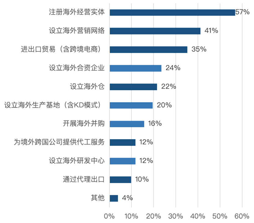 调研显示,57%的企业选择注册海外实体,41%的企业设立营销网络,这些依然是多数企业出海阶段采用的“轻资产、试水型”打法。