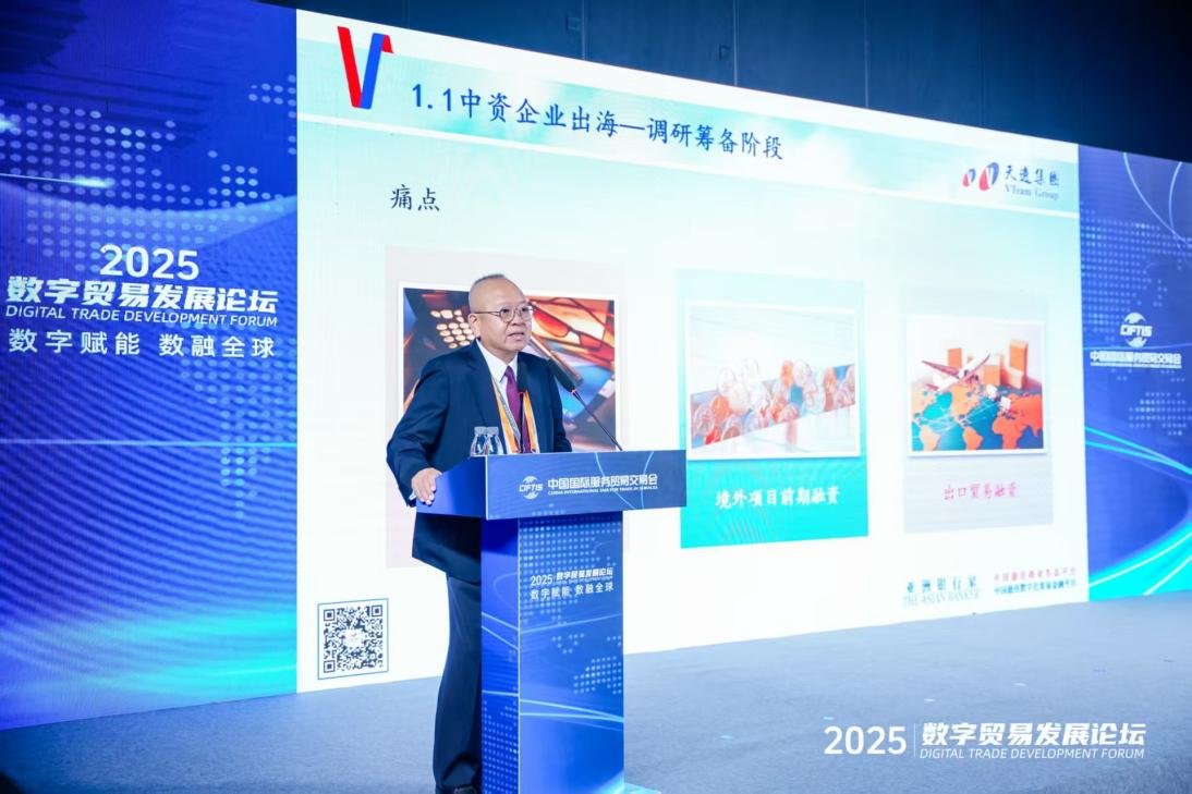 在「聚焦數字貿易出海戰略與全球機遇」專題環節,天逸集團董事長温峰泰結合天逸集團多年深耕國際市場的實戰經驗,深入剖析企業出海過程中面臨的核心挑戰與戰略機遇,並特別介紹了天逸在國際金融服務、海外銀行服務及合規風控等方面的數位化解決方案。