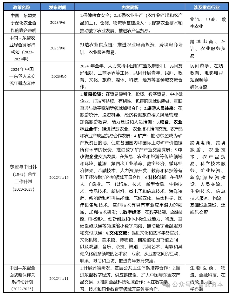 以中国对东南亚国家的签证政策变革为出发点,我们将分别从政策维度和产业维度对2024年中国与东南亚国家在跨境合作中的优势行业进行全面梳理,并从中获得中国与东盟国家贸易往来的利好行业全景。本文将从政策角度出发,重点分析中国与东南亚国家在规划政策和投资政策上的利好行业。