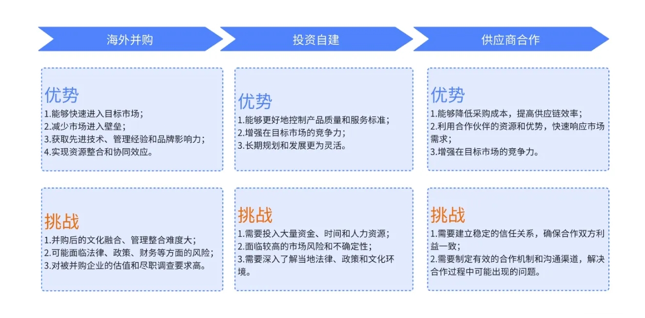 针对不同海外市场及各行业特点,中国企业的出海策略主要有三种路径:海外并购、投资自建和供应商合作。