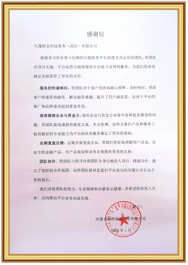 值此新春佳节前夕,天逸集团收到包钢集团发来的感谢信,信中高度赞扬了天逸在包钢供应链服务平台运营中的专业能力。凭借精湛的专业技能与精诚的合作精神,天逸集团助力该平台在2024年度取得了优异成绩。