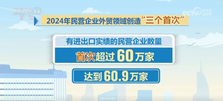 具体来看,第一个首次,是有进出口实绩的民营企业数量首次超过60万家,达到60.9万家,持续为外贸发展注入新生力量。