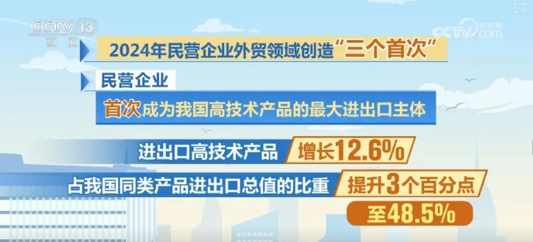 第二个首次,是民营企业首次成为我国高技术产品的最大进出口主体,进出口高技术产品增长12.6%,占我国同类产品进出口总值的比重提升3个百分点至48.5%。