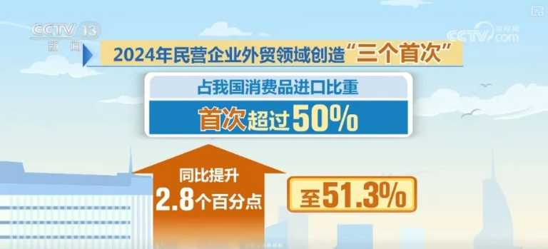 记者从海关总署了解到,民营企业已连续6年保持我国第一大外贸经营主体地位,2024年还创造了“三个首次”。作为外贸“主力军”,2024年,民营企业进出口24.33万亿元,同比增长8.8%,占我国外贸总值的比重提升至55.5%。