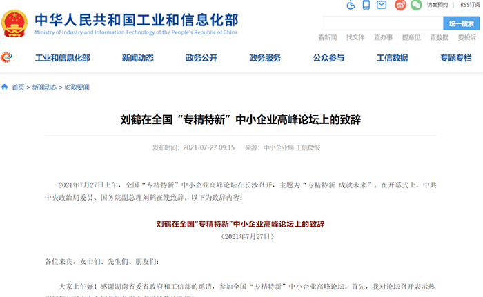 2021年7月27日上午,全国“专精特新”中小企业高峰论坛在长沙召开,主题为“专精特新 成就未来”。在开幕式上,中共中央政治局委员、国务院副总理刘鹤在线致辞。