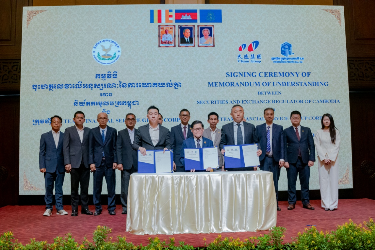 2025年12月12日,天逸集团与柬埔寨证券交易监管局(SERC)在柬埔寨首都金边共同签署吴哥窟证券化战略合作备忘录。柬埔寨证券交易监管局(SERC)局长H.E. SOU Socheat、天逸集团董事长温峰泰、天逸集团董事梁海宁共同出席签约仪式。